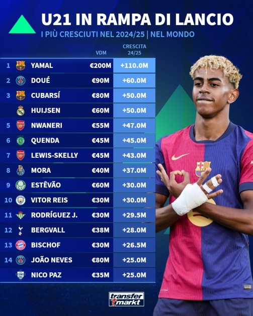 6月28日讯 德转列U21球员24-25赛季身价涨幅排行,亚马尔+1.1亿欧居首,杜埃+6000万欧第二,库巴西、怀森并列第三。