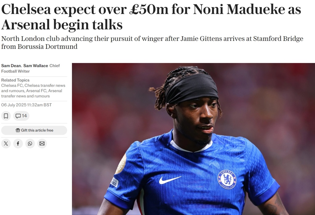 07月06日讯 英媒《每日电讯报》最新消息,切尔西对马杜埃凯的要价超5000万英镑,阿森纳正在就转会进行谈判。