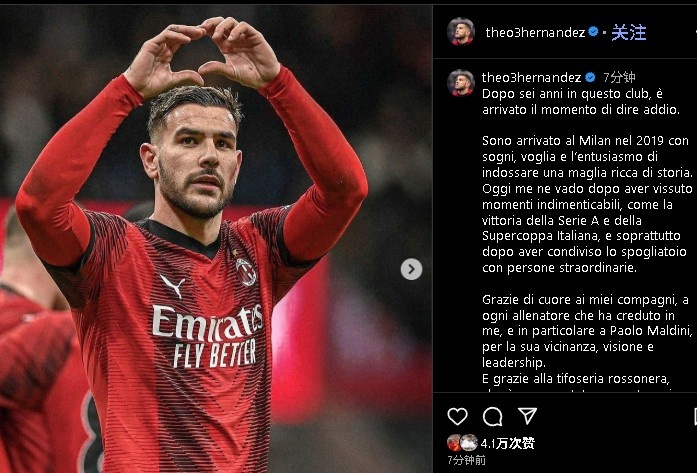 7月11日讯 米兰官方宣布,将特奥永久性出售给利雅得新月。特奥更新社媒,告别米兰。
