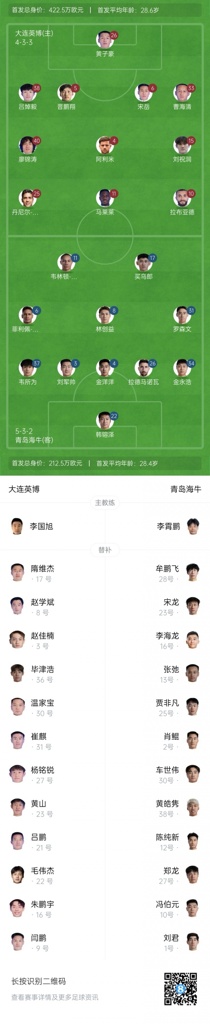 大连英博替补:17-隋维杰、3-赵佳楠、8-赵学斌、30-温家宝、31-崔麒、36-毕津浩、21-吕鹏、22-毛伟杰、23-黄山、27-杨铭锐、9-闫鹏、16-朱鹏宇