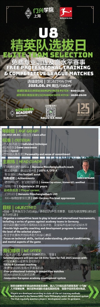 8月19日讯 官方消息,门兴上海学院招募U8精英队,入选小球员将享受训练装备、训练费用全免。