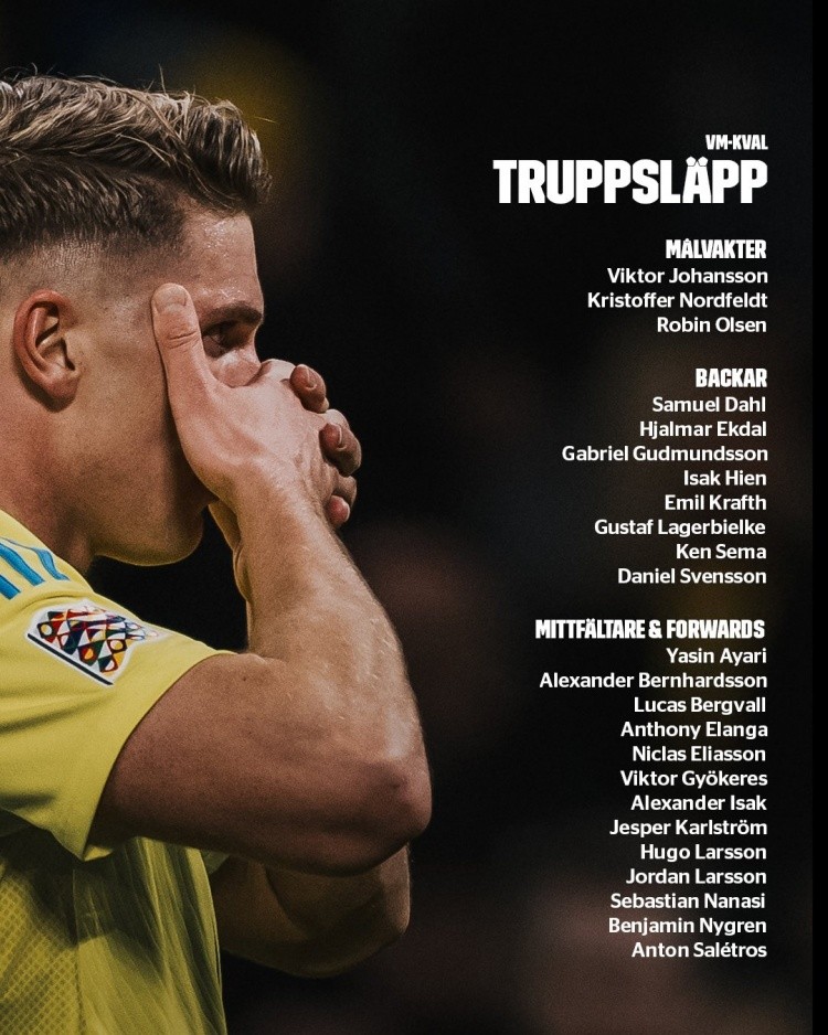 中前场:亚辛-阿亚里(布莱顿)、伯恩哈德森(基尔)、贝里瓦尔(热刺)、伊兰加(纽卡)、埃利亚松(雅典AEK)、约克雷斯(阿森纳)、伊萨克(纽卡)、卡尔斯特罗姆(乌迪内斯)、雨果-拉尔森(法兰克福)、乔丹-拉尔森(哥本哈根)、纳纳西(斯特拉斯堡)、本杰明-尼格伦(凯尔特人)、萨莱特罗斯(AIK索尔纳)